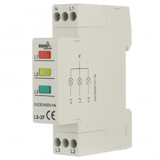 Trzy diody LED. Kolory: żółta, czerwona, zielona. Napięcie zasilania 3×230 V+N.
