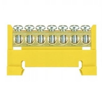 Listwa zaciskowa montowana na szynę montażową DIN TH-35 mm. Stosowana do rozdzielnic elektrycznych. Listwa posiada niską podstawę. Kolor żółty. Przekrój przewodu: 16mm² i liczba torów 7.
